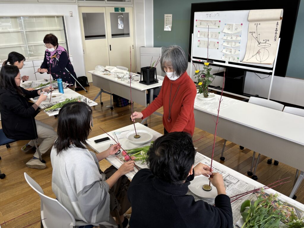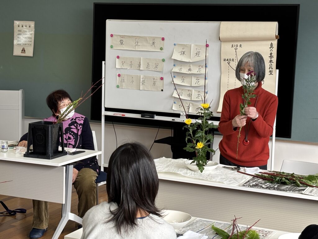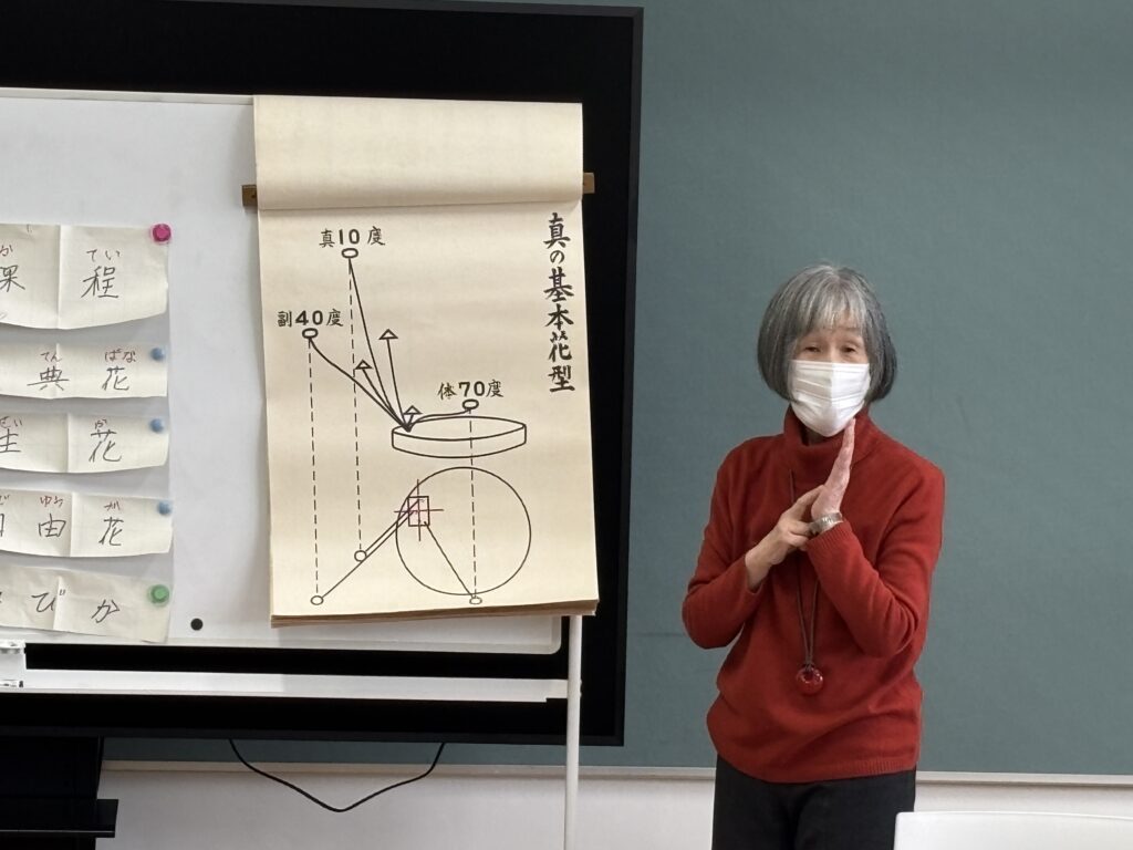 大曾根先生から,まず龍生派の基本花型を教えていただきました。その後,先生が,お花を生けながら生ける花の順番や生け方について教えていただきました。