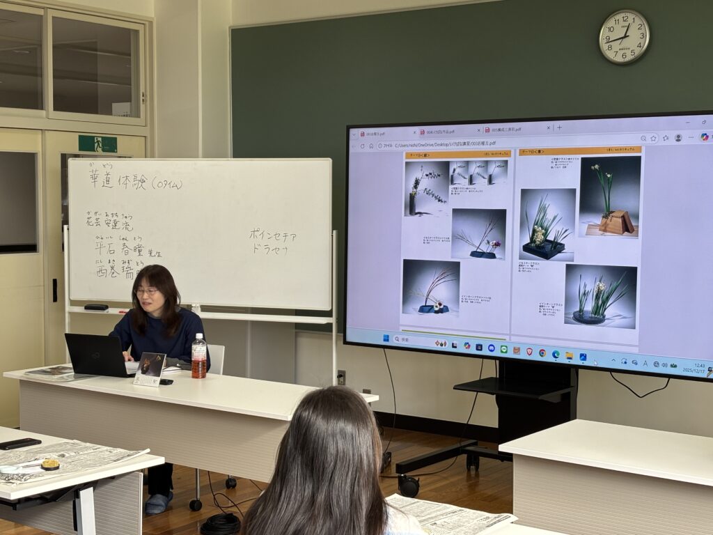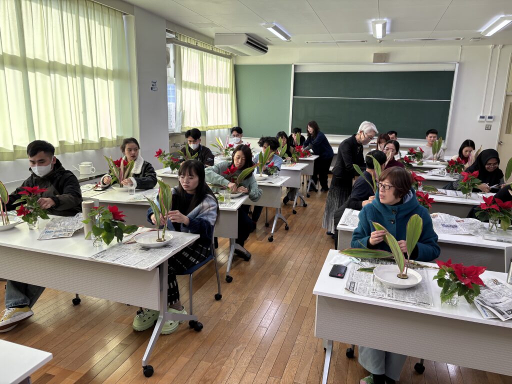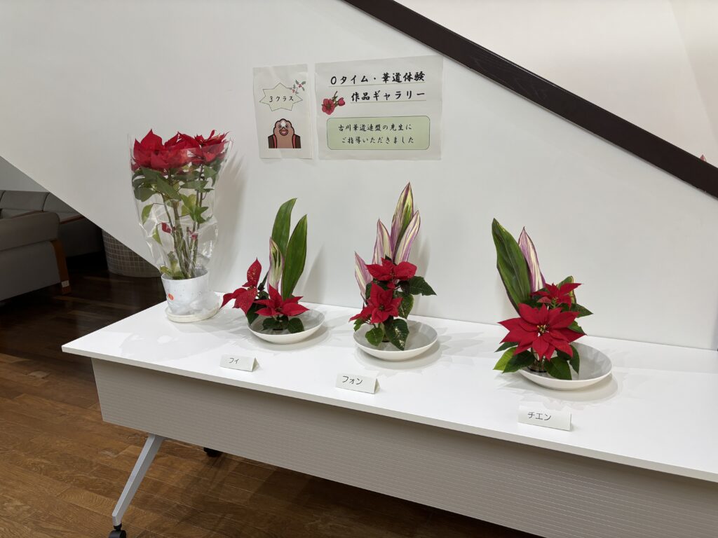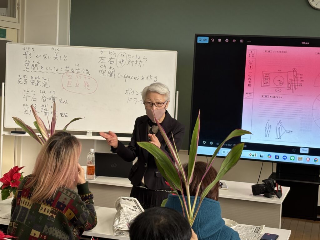 12月17日(水) 3クラス(進学1年6か月課程)でOタイムの時間に華道体験をしました。今回の華道体験では,花芸安達流の平石春曈先生と西巻曈先生に教えていただきました。