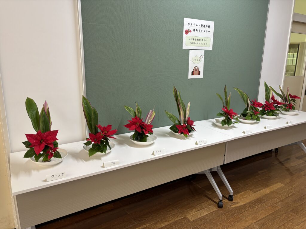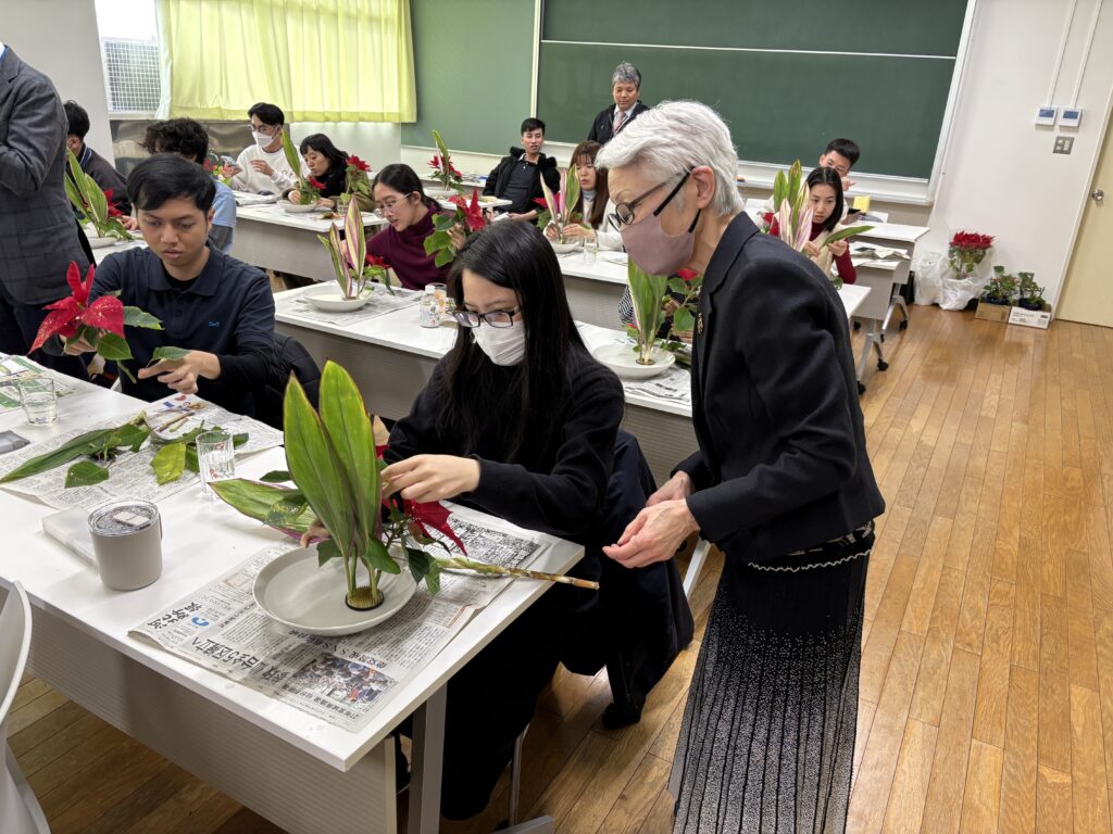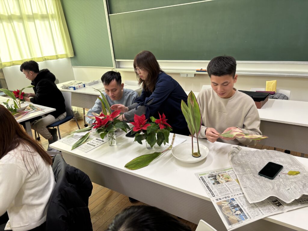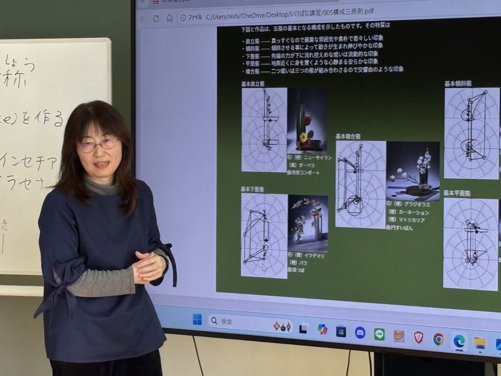 12月17日(水) 3クラス(進学1年6か月課程)でOタイムの時間に華道体験をしました。今回の華道体験では,花芸安達流の平石春曈先生と西巻曈先生に教えていただきました。