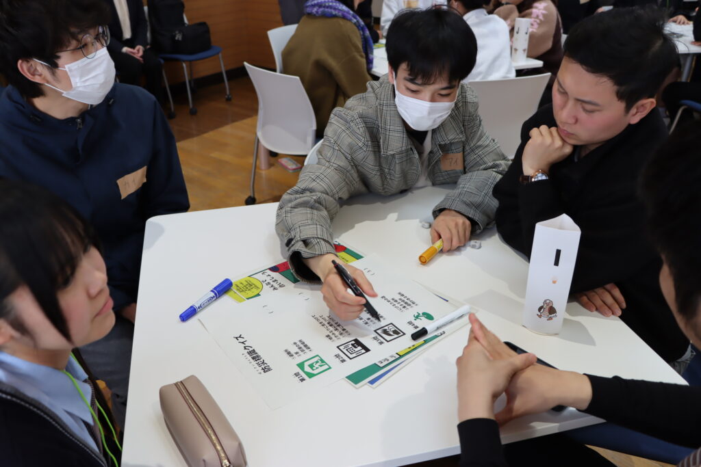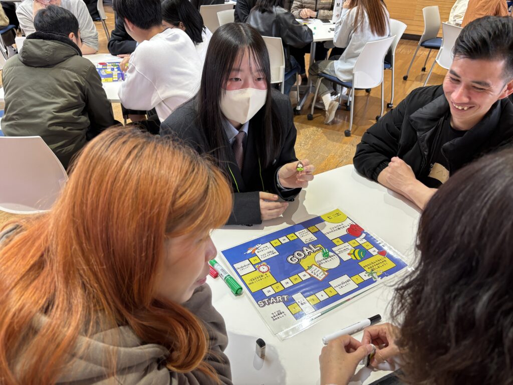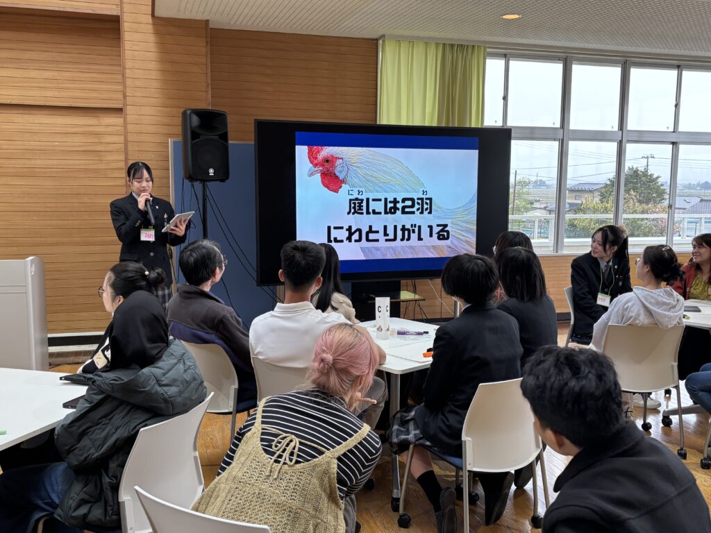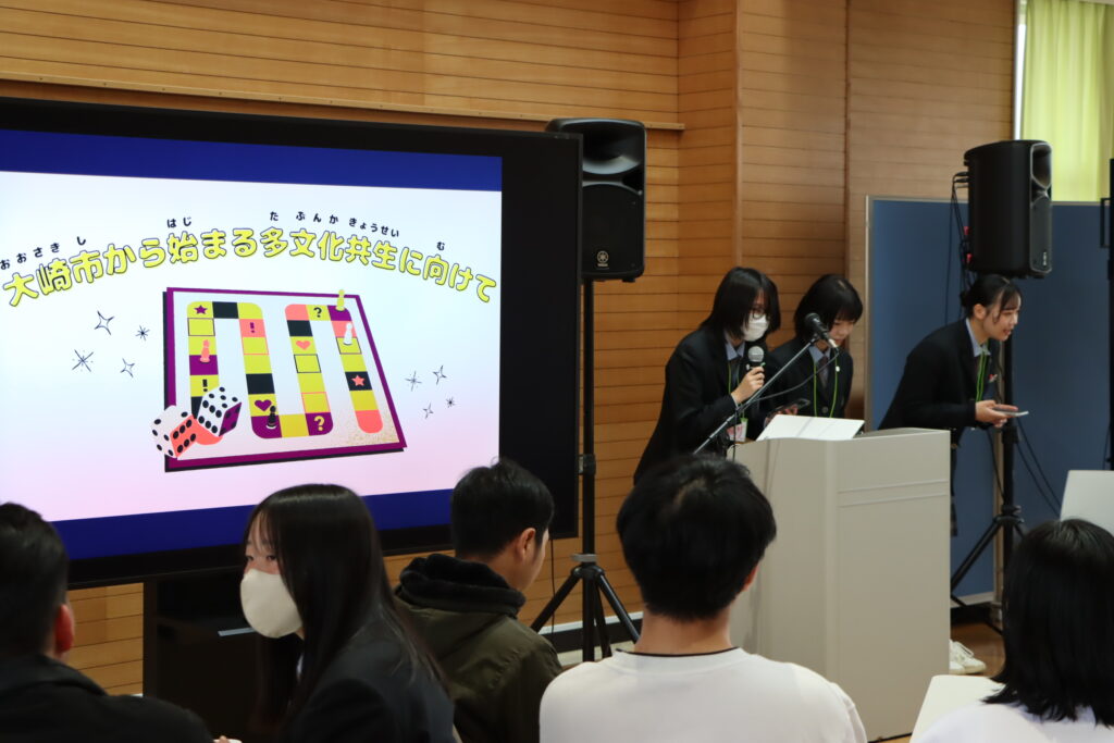 初めに発表したグループは「交流すごろく」です。このすごろくは,外国人用に日本語能力別に工夫され,楽しく大崎の事が分かるような内容になっています。