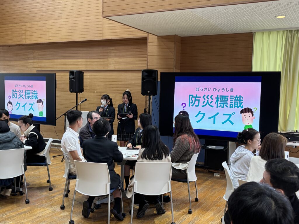 「防災標識クイズ」などで,本校生徒に防災標識の見方について教えてくれました。最後に,さらに外国人にも分かりやすい避難所看板を作るためにどうしたよいのかを,本校生徒と一緒に考えました。