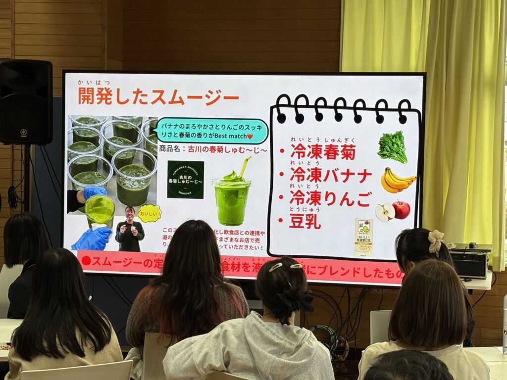 最後は「春菊スムージー」グループの紹介です。食品ロスと誰でもが栄養を簡単に取りやすい飲み物の紹介です。「ハラル食でもあり,栄養を簡単においしく取れますよ。」と紹介がありました。
