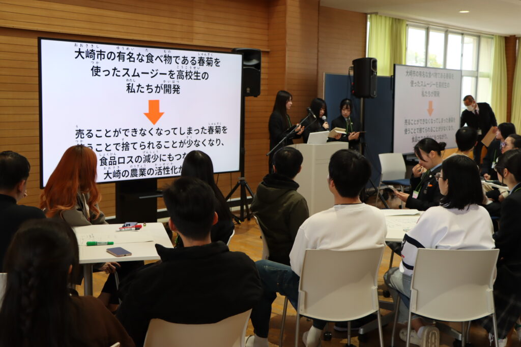 4月27日(月) Oタイムの時間で,古川黎明高校生徒の皆さんが,昨年度総合学習の探究の時間で取組んできた研究内容を発表してくれました。「多文化共生社会の共生及び発展」をテーマに黎明高校の生徒さんが取組んだ3つの取り組みです。