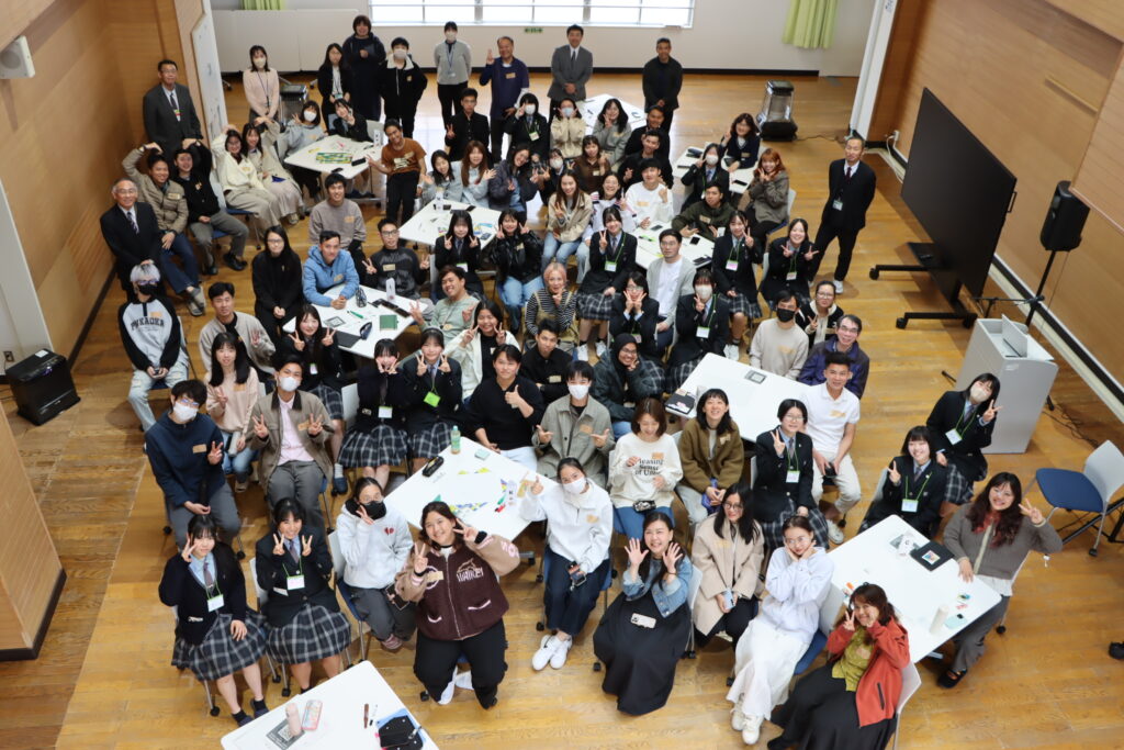 話合いがしやすいように,両校混合の5・6人1テーブルで14班に分かれて交流会が進められました。